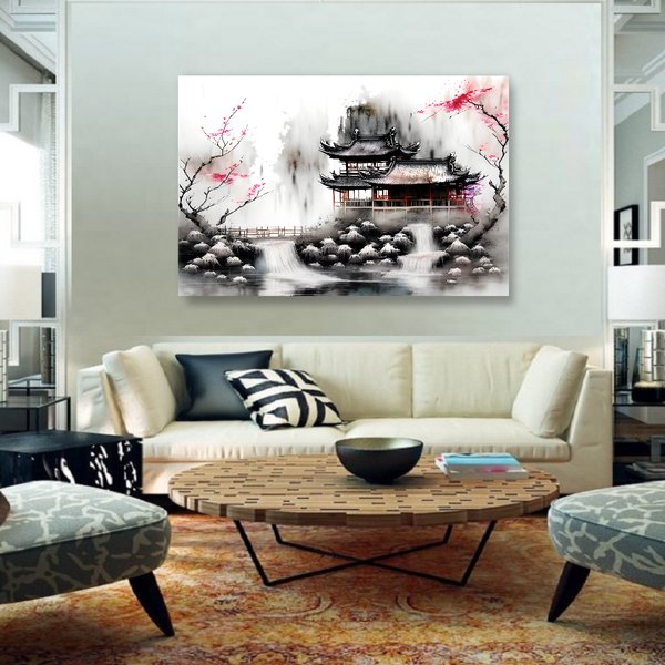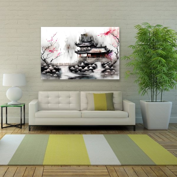 Японская живопись с имитацией водных чернил на рисовой бумаге. Выполняется с использованием современных технологий печати и ручной обработки. Заключительное лицевое покрытие из акрилового стекла придаёт картине невероятную выразительность, объём и защиту от внешнего воздействия.