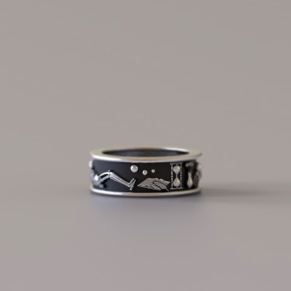 На кольце изображены элементы, относящиеся к жанру живописи «Vanitas» эпохи барокко XVI-XVII веков: скелет, ваза с цветами, книга, перо, мыльные пузыри и песочные часы. Подобные картины предназначались для напоминания о быстротечности жизни, тщетности удовольствий и неизбежности смерти.