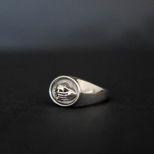 Кольцо ручной работы с изображением черепа в руках.