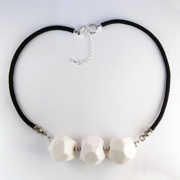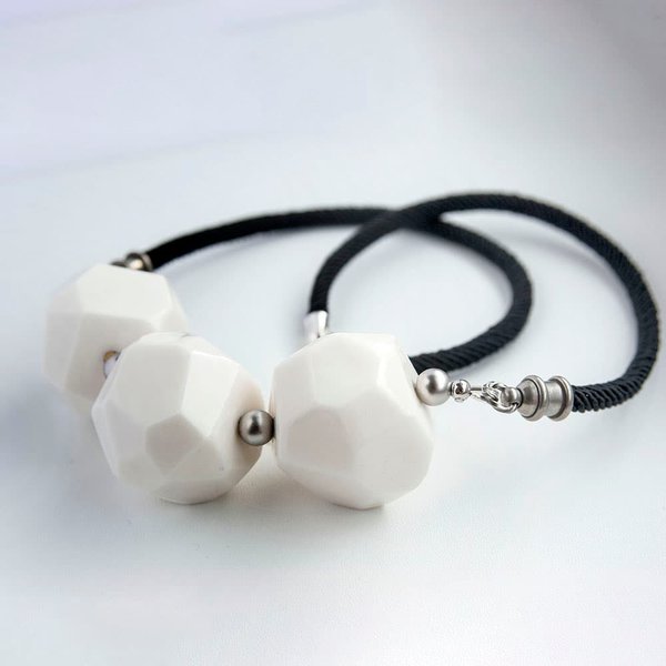 Колье ручной работы с белыми бусинами из фарфора, покрытыми глазурью. Чёрный текстильный шнур.