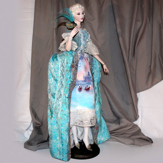 Романтичная, нежная девушка олицетворяет собой Венецию — карнавальную, яркую, наполненную загадками и тайнами, скрытыми под тенью вееров и масок. Любуясь куклой, мы невольно переносимся в Италию второй половины XVIII века. Платье стиля рококо очень точно передаёт эпоху, выполнено в нежных, пастельных тонах, украшено множеством мелких деталей: кружевом, вышивкой, характерным узором.