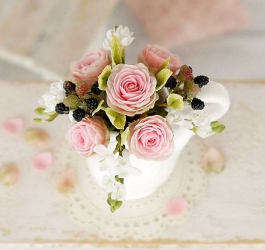 Букет для кукольных домиков в масштабе 1:12 прихвачен тейп-лентой. По желанию клиента перевязывается шёлковой ленточкой. Ленту можно снять и использовать цветы по отдельности. Изготовлен из японской полимерной глины — холодного фарфора, позволяющего создавать тончайшие лепестки.