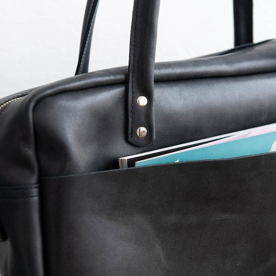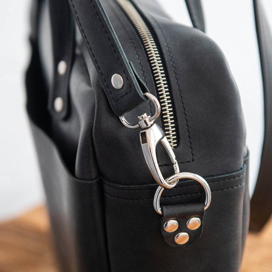 Очень вместительная мужская сумка с длинными ручками. Выполнена из натуральной кожи высокого качества, чёрного цвета.