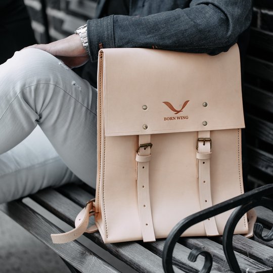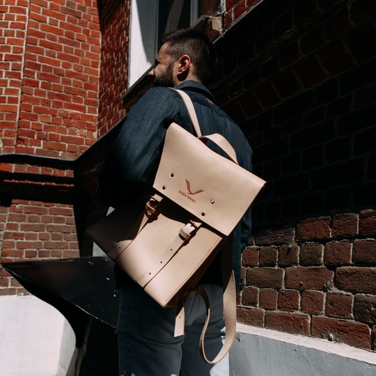 Рюкзак ручной работы выполнен из кожи растительного дубления толщиной 2,8-3 мм. Цвет: оригинальный (бежевый — неокрашенный). Седельный шов, латунная фурнитура.