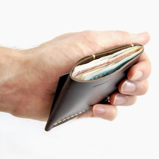 Настолько компактный, что можно носить в кармане рубашки. Боковой карман вмещает три карты, основной отдел — для наличных или ещё для пары карт.