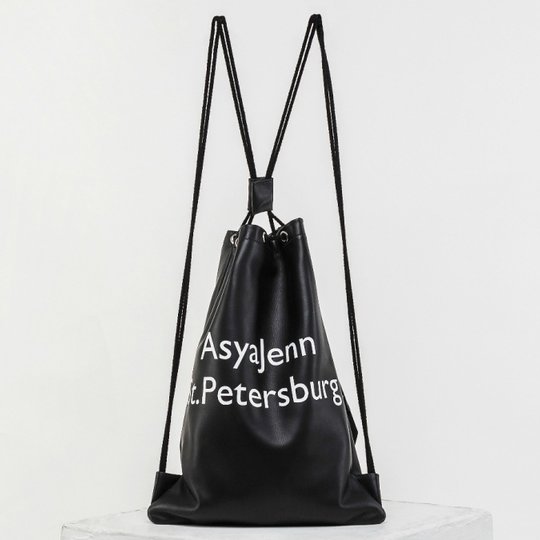 Рюкзак в виде мешка с двумя ремешками, позволяющими носить его на спине. Выполнен вручную из натуральной кожи чёрного цвета, высокого качества. Внутри – одно отделение. Без подкладки. Надпись нанесена методом термопечати.