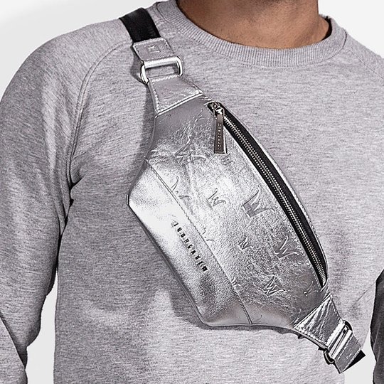Поясная сумка закрывается на металлическую молнию. Внутри — карман на молнии и накладной карман. Снаружи на задней стенке расположен дополнительный большой карман на металлической молнии, куда вмещается большой телефон.