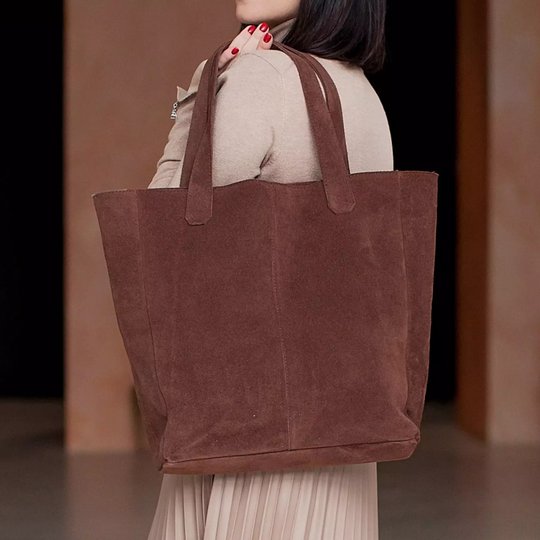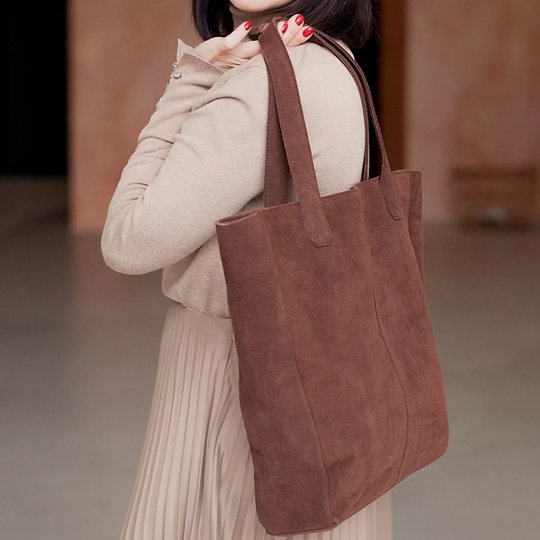 Авторская сумка-шоппер ручной работы из натуральной замши. Закрывается на кнопку, внутри — два боковых кармана, один из которых на молнии. Сумка держит форму, вместительная и удобная.