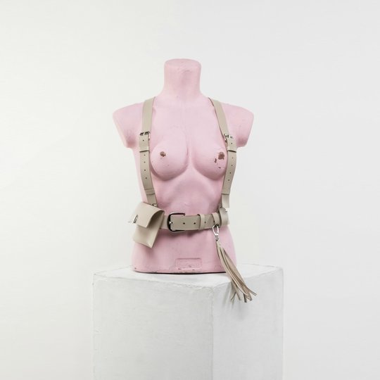 В комплекте — отсоединяемый клатч. Сценарии использования зависят только от вашей фантазии: можно надеть как портупею с клатчем или без него, можно — как пояс с клатчем (в виде поясной сумки), а можно отделить клатч, который будет отлично смотреться в руках в тон поясу.