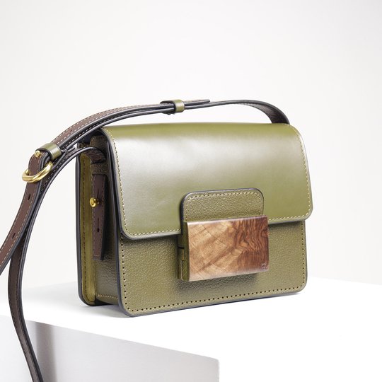 Сочетание зелёной фактурной и гладкой кожи с массивным замком из дерева — выделяет эту модель среди прочих. Приятный тёмно-зеленый цвет переносит вас на зелёные луга, окружённые лесом. Массивный замок из ореха и дуба, как центр композиции, будет притягивать восторженные взгляды. Наслаждайтесь. Такая сумка будет только у вас, так как природный рисунок ореха неповторим!
