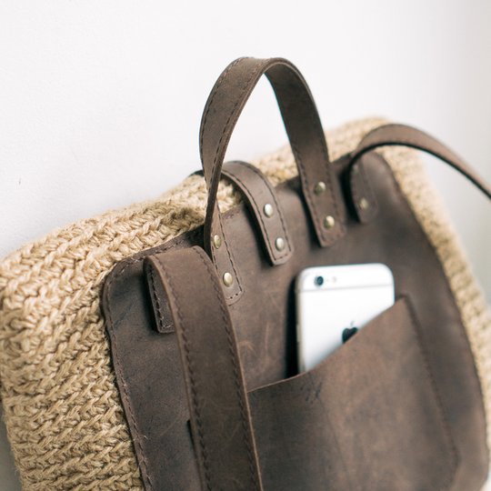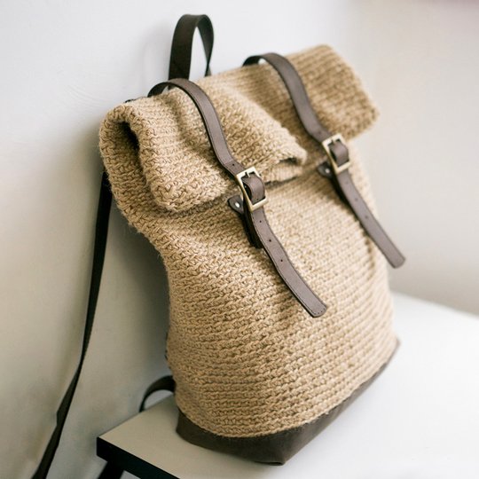 Большой и стильный рюкзак ручной работы из джута и натуральной кожи.