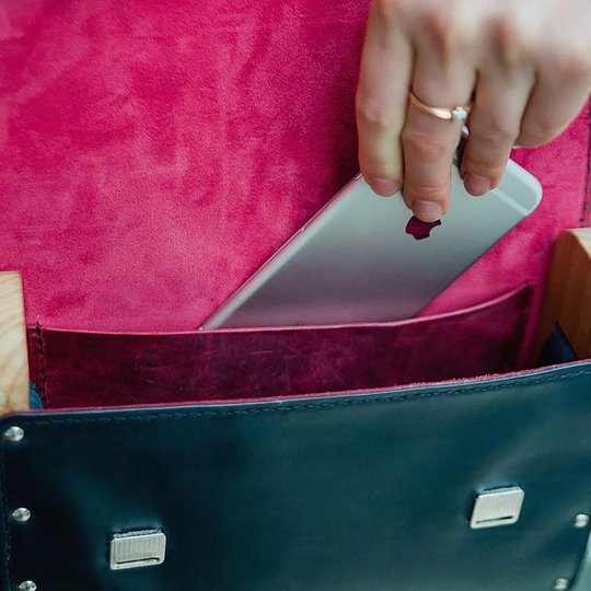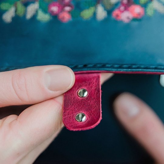 Натуральная кожа, окрашена в насыщенный синий цвет. Внутри — бархатистая кожа цвета фуксии. Бока выполнены из натурального дерева — вяз. Прошита аккуратным ручным швом крепкой вощёной нитью. Закрывается на два магнитных замочка. На клапане объёмная ручная вышивка «Ягоды».