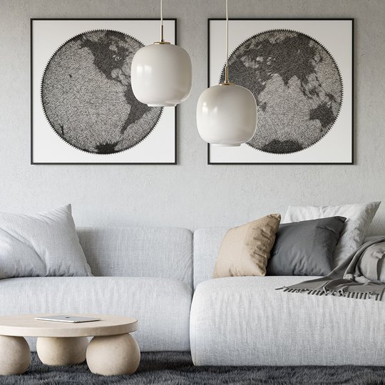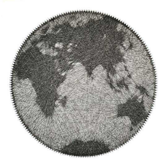 Карта полушарий планеты Земля, состоящая из двух полотен выполненная в уникальной авторской технике: прочная полимерная мононить длиной более 1,5 км размещена на двух сотнях алюминиевых шпильках, закреплённых на деревянной основе, образуя видимый рисунок. Полностью ручная работа.