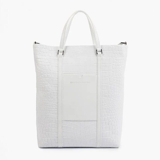 Объёмная лаконичная сумка ручной работы среднего размера из натуральной кожи с тиснением под кожу крокодила. Цвет: белый. Застёгивается на металлическую молнию. Открытый передний карман-клапан.