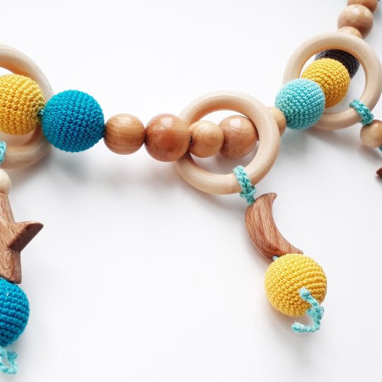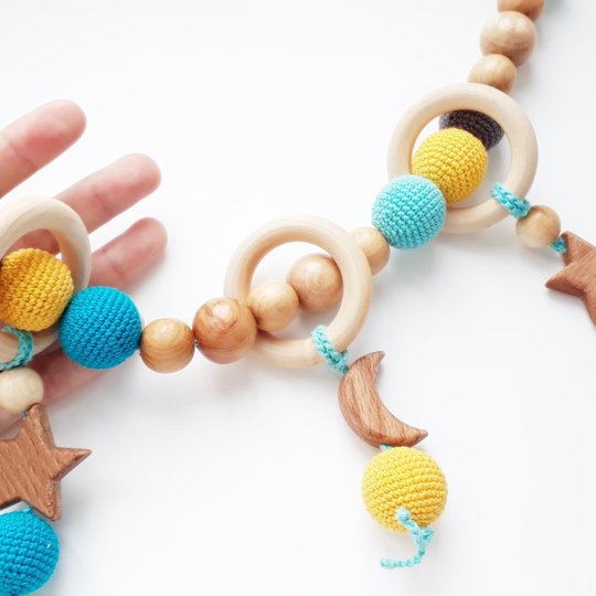 Растяжка ручной работы полностью деревянная из пород — можжевельник, бук. Обвязка хлопковыми нитками. Крепится к детской кроватке хлопковым вывязанным шнуром. Подвески на кольцах двигаются по всей длине растяжки. Можно снять и использовать как грызунки.