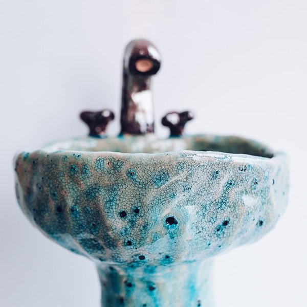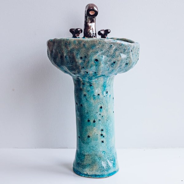Керамическая ваза в форме старого рукомойника слеплена вручную из немецкой глины.