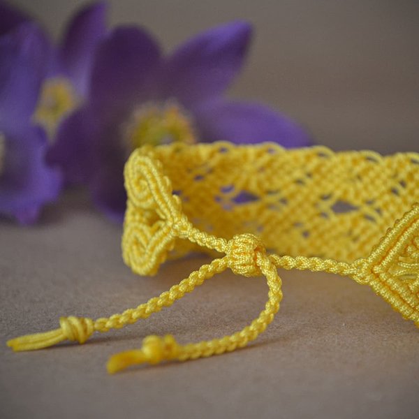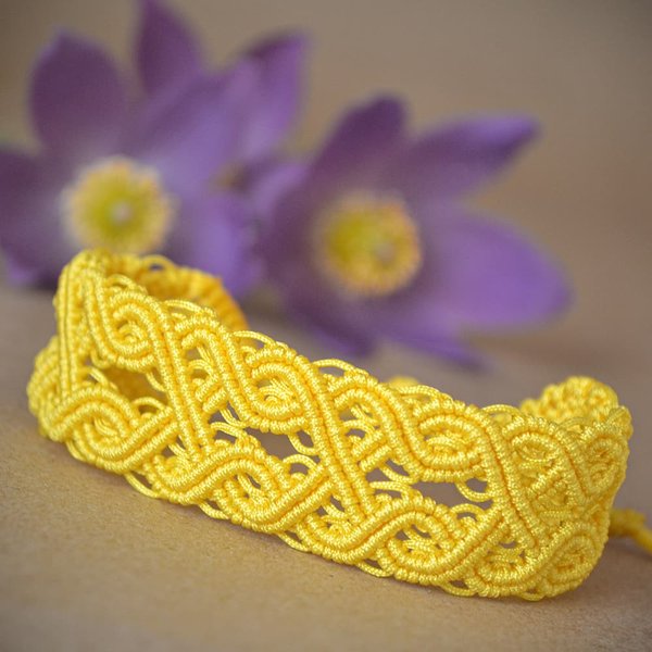 Выполнен из шнура толщиной 1 мм. Ширина браслета — 2,4 см. Плавающая застёжка.